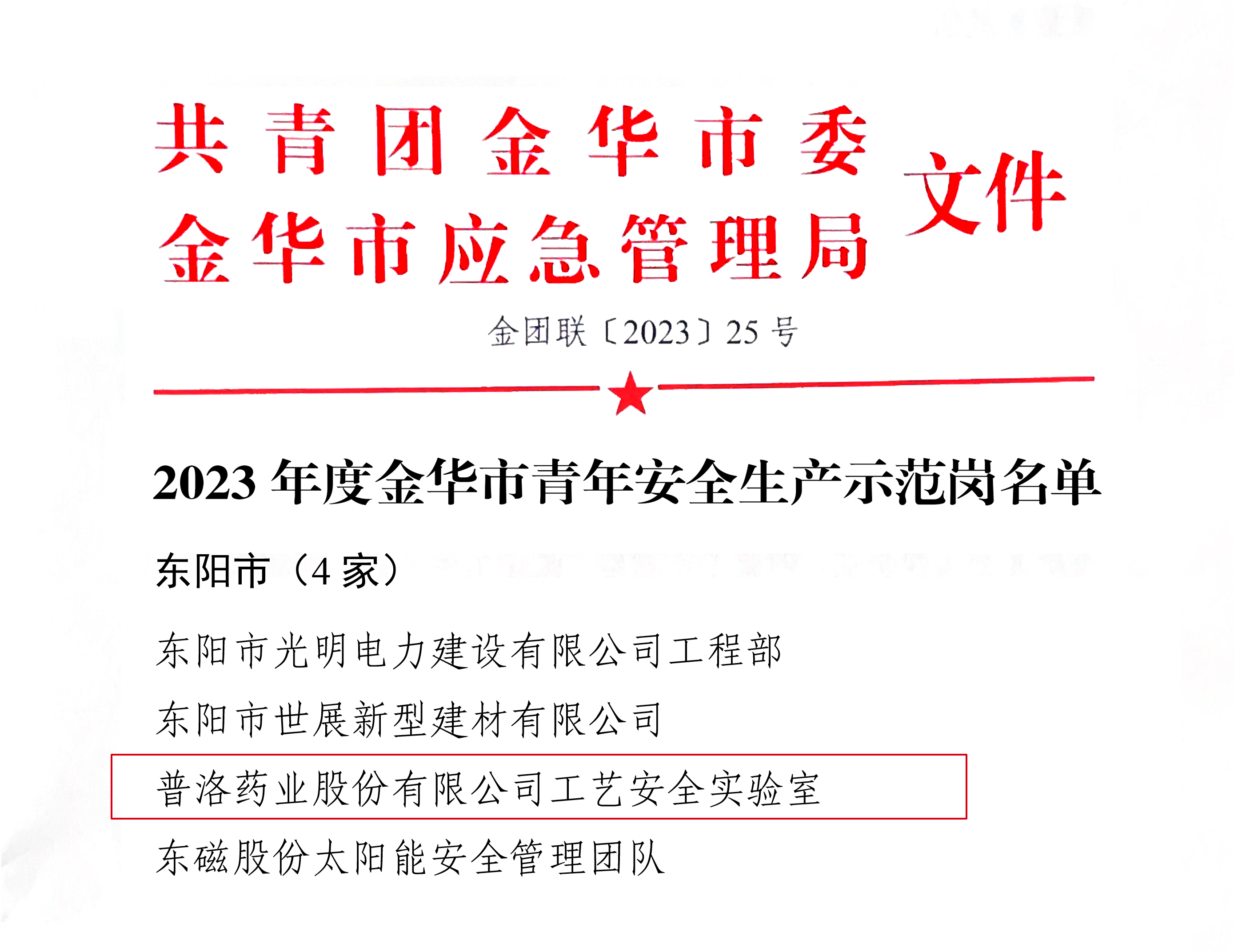 近日,金華市總工會對2023年金華市先進職業操作法進行了名單公示,“普洛藥業工藝安全評估體系”在列。同時,共青團金華市委、金華市應急管理局聯合發文公布2023年度青年安全生產示范崗名單,“普洛藥業工藝安全實驗室”成功入選。