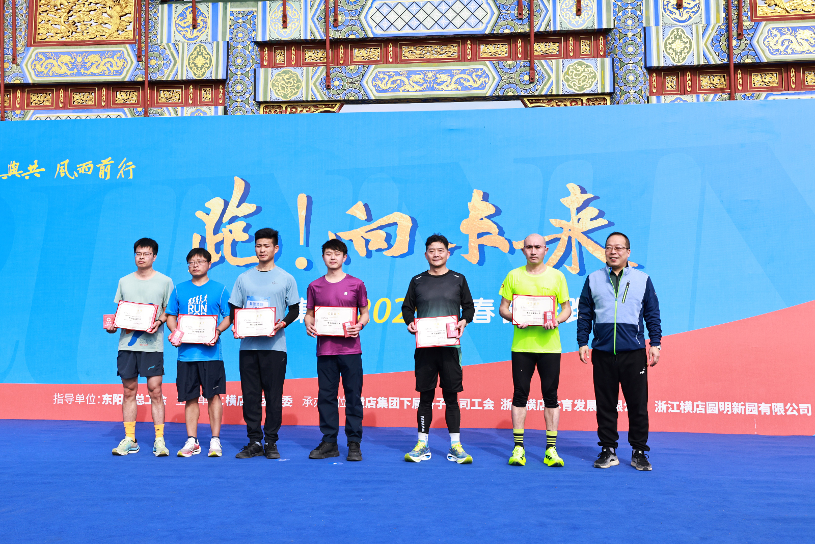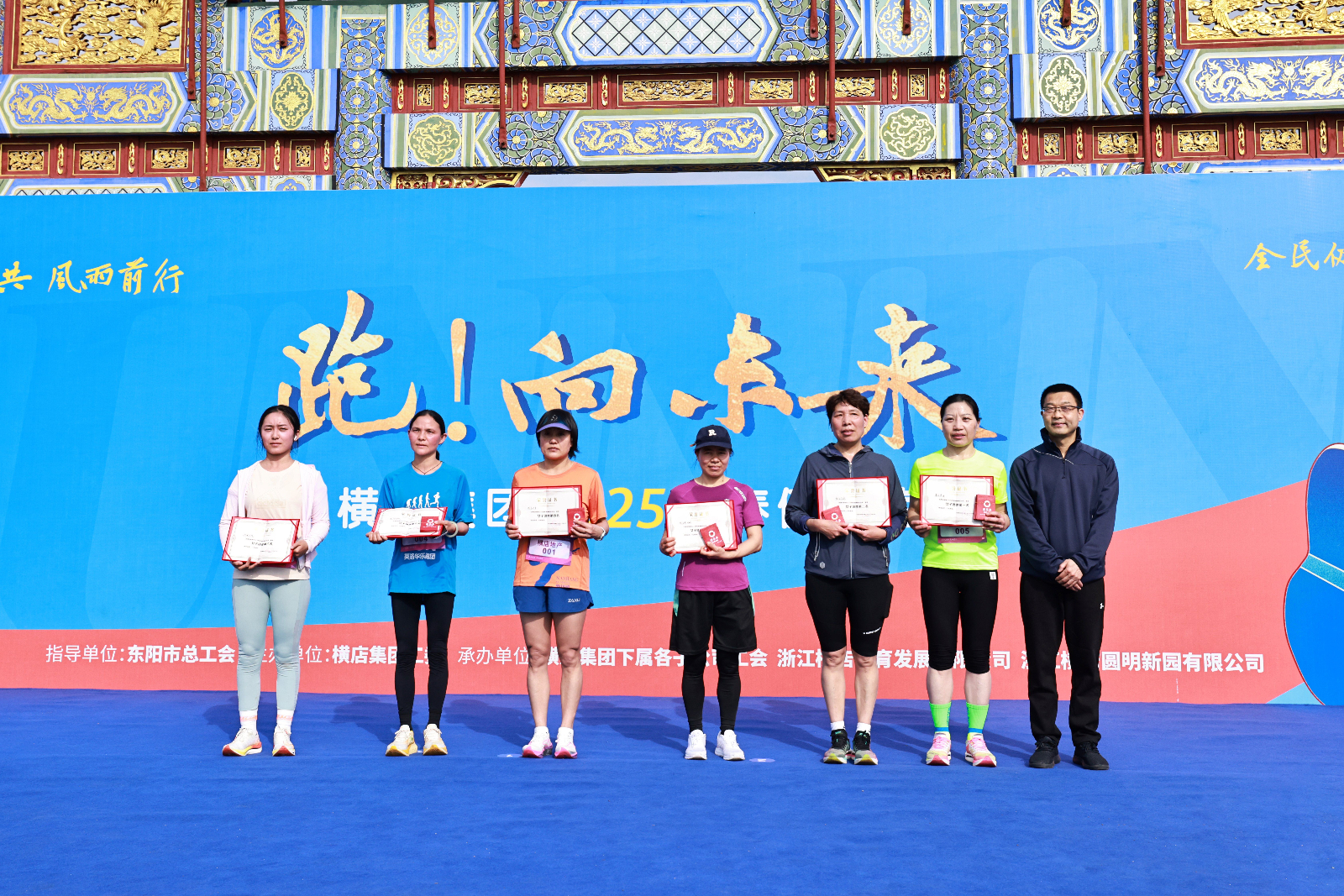 競技組選手憑借卓越體能與策略配合,全程領跑;大眾組則在雕梁畫棟間暢享運動之趣,用笑容和汗水傳遞著活力與熱情。賽道兩側助威聲此起彼伏,現場氛圍熱烈激昂。就在男子組(劉當銳、關鍵、王君偉、葛華樑、王飄)與女子組(吳牡丹、斯金丹、張進萍、陳方丹、郭小萍)沖過終點線的奪冠瞬間,沸騰的歡呼聲此起彼伏,從賽場的各個角落匯聚而來,將現場的氣氛推向了最高潮 。